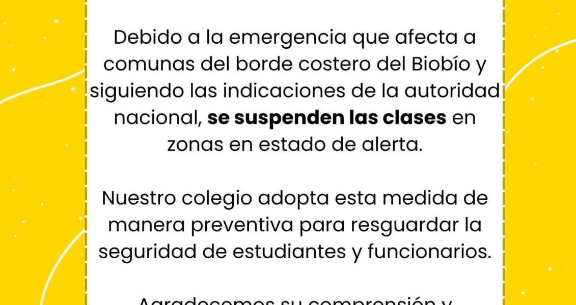 Informamos que, debido a la emergencia que afecta a las comunas del borde costero de la región del Biobío y en atención a las indicaciones entregadas por la autoridad nacional, se suspenden las clases en todas las zonas que se encuentren en estado de alerta.